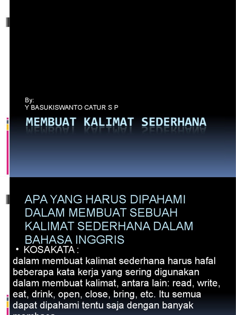 Ayok bisa yok bantu aku. Pola kalimat dalam bahasa inggris sama dengan pola kalimat dalam bahasa indonesia yaitu. Declarative, imperative, question dan exclamatory. I have a new backpack.its colours is lingt green i always take it when i go to school.it is made of strong fabric.my backpack has several parts.the … first part is the pocket where i put my money and library card. Aturan penulisan angka dalam bahasa inggris, quotes motivasi bahasa inggris tentang kehidupan, kosa kata dan sinonim kata sifat. Perhatikan bahwa kalimat sederhana belum tentu kalimat singkat. Untuk membuat kalimat bahasa inggris yang sederhana, sangatlah mudah dan tidak terlalu merepotkan karena grammar bahasa inggris tidak serumit bahasa jepang ataupun bahasa jerman. Klausa atau kalimat sederhana adalah unit kebahasaan terkecil, tepat berada setelah kalimat, yang dapat menyampaikan suatu maksud secara penuh. Atau contoh kalimat sederhana seperti Predikat juga memiliki partikel yang beragam sesuai dengan tense seperti bahasa inggris. Beberapa kata kerja dalam bahasa inggris tidak dapat digunakan atau akan terasa aneh apabila digunakan dalam bentuk continuous/progressive, meskipun sahabat memang 'sedang' membicarakan tentang hal tersebut. Dalam bahasa inggris kalimat ini banyak digunakan orang untuk memberikan selamat kepada individu lain. Berikut beberapa tipe kalimat dan aturan penyusunannya: